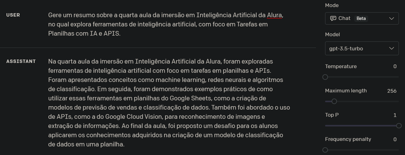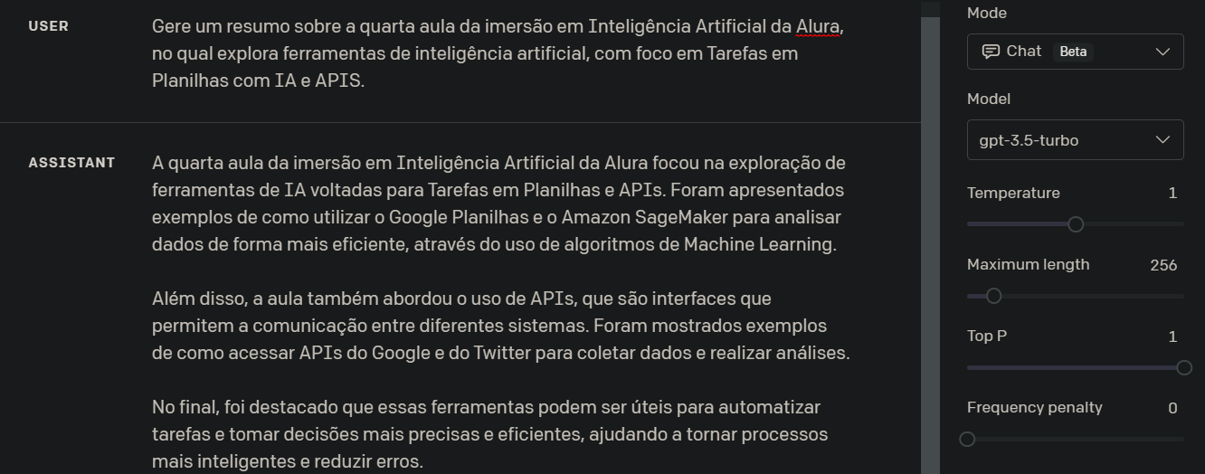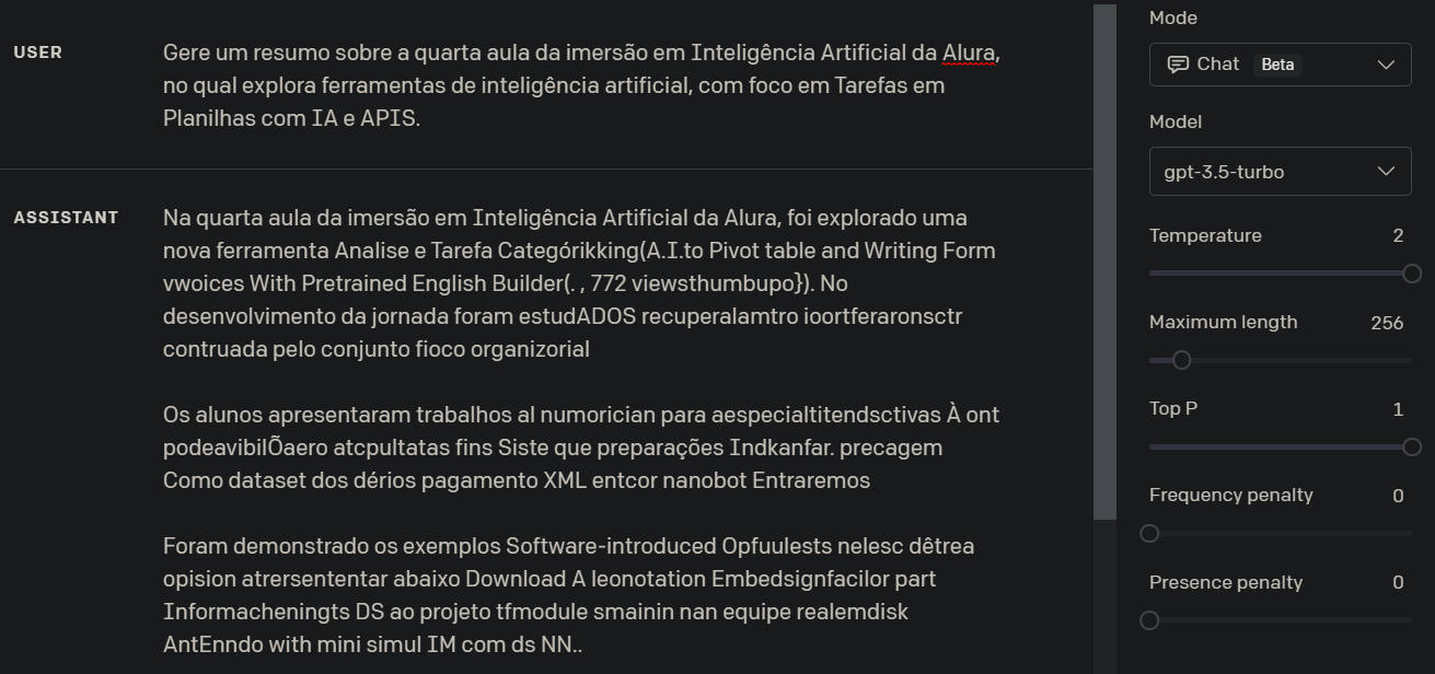 Além disso, utilizando o Playground OpenAI, pude experimentar diferentes formulações de texto a partir da definição de temperatura, onde pode-se visualizar e analisar as diferenças que isso gera:
