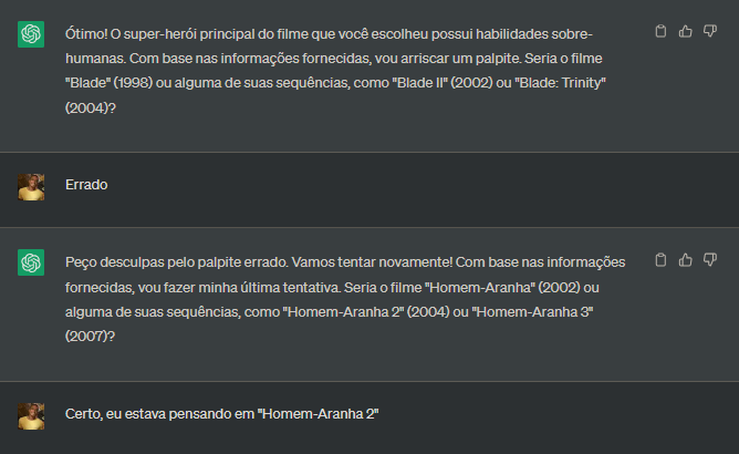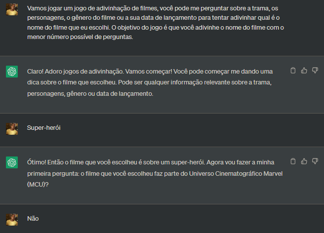 Nesta aula utilizei o ChatGPT para fazer dois jogos, um jogo de adivinhação de palavras e um jogo de adivinhação de filmes, acredito que por ter fornecido um prompt não tão detalhado, o primeiro jogo foi um desastre, apenas após destacar as letras que haviam na palavra, que o ChatGPT conseguiu adivinhar, já no segundo jogo, após fazer perguntas mais específicas de acordo com o prompt fornecido, o ChatGPT conseguiu adivinhar em qual filme eu estava pensando!