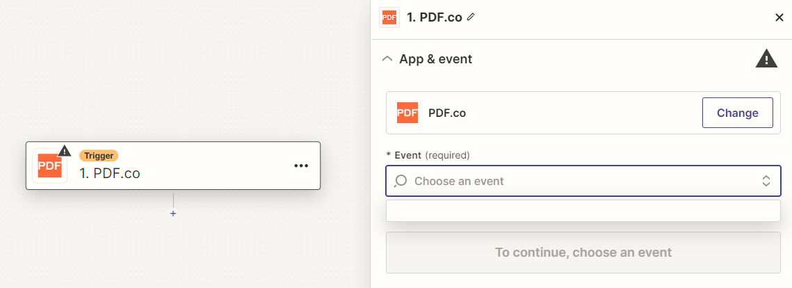 Mesmo utilizando os próprios atalhos fornecidos no site PDF.co, o campo de Event ainda fica indisponível, no qual o sistema me impede de prosseguir, pois o mesmo se trata de um campo obrigatório.