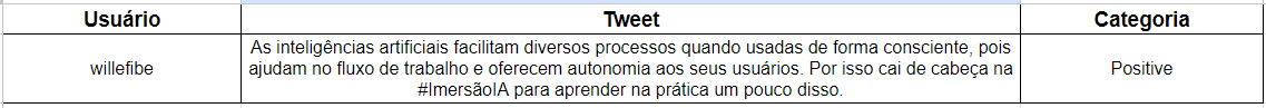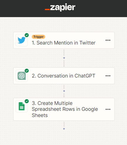 Através do Zapier eu criei vários "Zaps", no primeiro Zap utilizei o Twitter como um trigger para o funcionamento do processo, onde seria selecionado um tweet com a seguinte hashtag: #ImersaoIA, em seguida criei outro Zap direcionando o ChatGPT a gerar um comentário relacionado ao tweet em questão, e por fim um Zap gerando essas informações em uma planilha do Google Sheets que eu já havia criado.