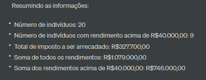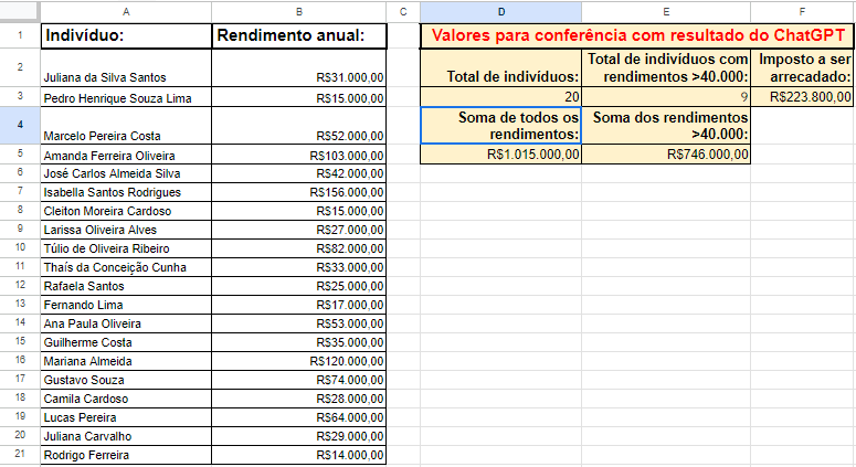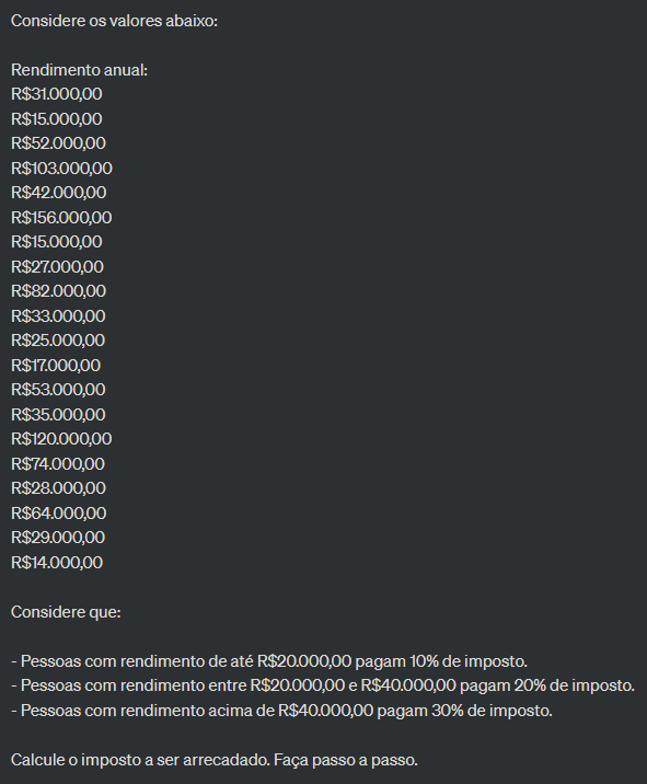 Explorando a Engenharia de Prompt e aprendendo sobre as suas principais técnicas e como utilizá-las, procurando aprimorar o meu domínio do funcionamento do algoritmo do ChatGPT. Utilizando da planilha disponilizada no material da aula 3, tentei calcular o valor do imposto de renda de 20 indivíduos, com as seguintes condições: