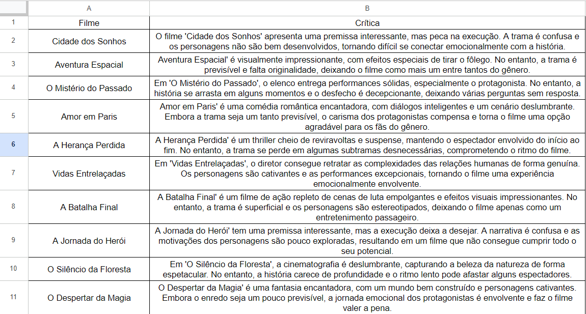 Nesse desafio foi necessário gerar 10 críticas variadas para filmes diversificados, em seguida a resposta foi convertida em formato CSV e importada para a plataforma do Google Sheets.