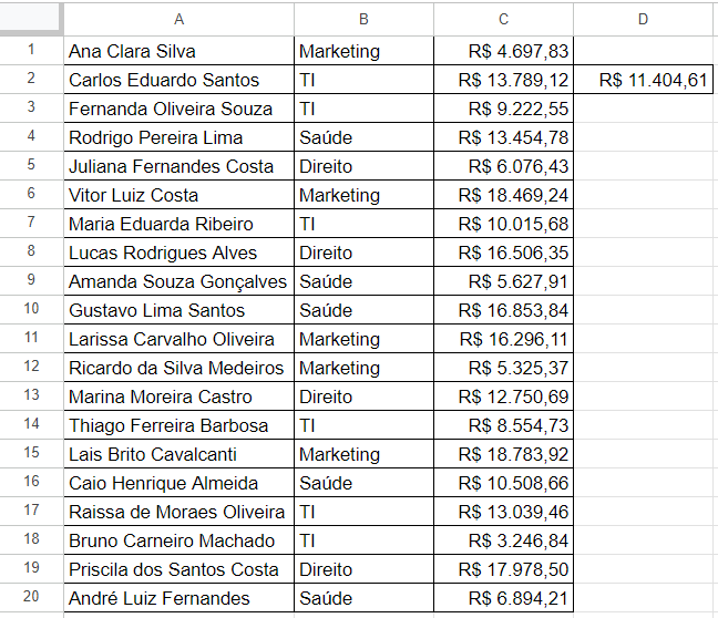 No terceiro desafio, a partir da extensão SheetGPT, foi usado o comando GPTLIST() no Google Sheets, onde foram gerados 20 nomes aleatórios de pessoas brasileiras na coluna A, suas respectivas áreas de atuação na coluna B, e valoras de salários aleatórios entre 1.000 e 20.000 reais na coluna C.