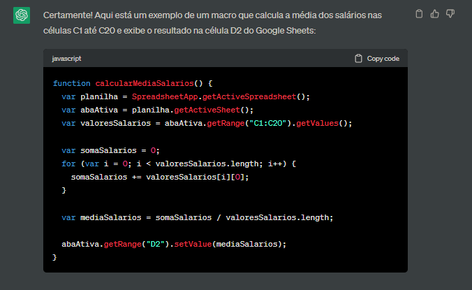 Após formular a tabela, pedi para o ChatGPT criar um macro baseado na minha planilha do Google Sheets, em que seria calculado a média dos salários da coluna C, mostrando o resultado na célula D2, como podemos ver na imagem acima.