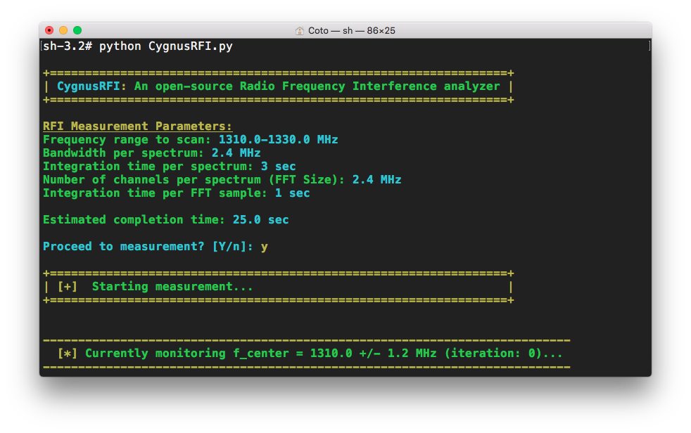 You will then be asked to confirm your measurement parameters, and from there, you can let CygnusRFI do its magic! Once the observation is finished, your data will be processed, analyzed and saved as rfi_plot.png (in the same directory as observe.py).