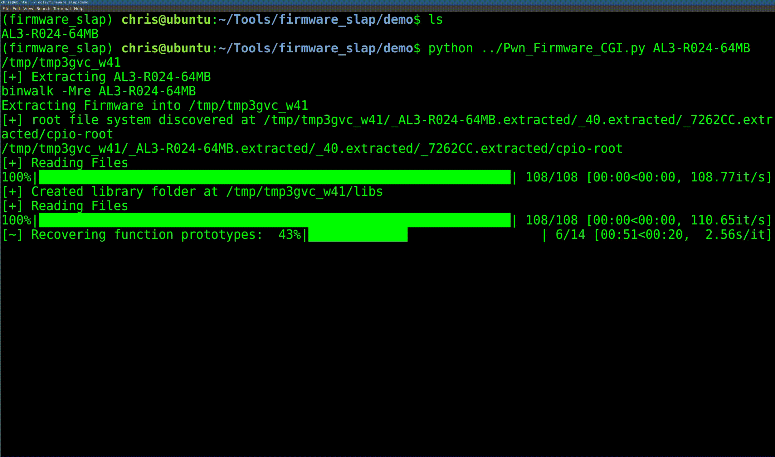 Firmware slap combines concolic analysis with function clustering for vulnerability discovery and function similarity in firmware. Firmware slap is built as a series of libraries and exports most information as either pickles or JSON for integration with other tools.