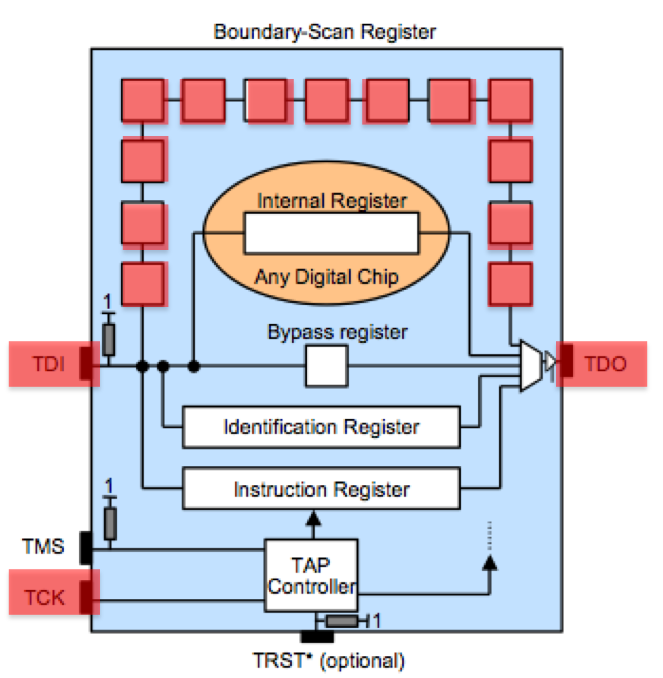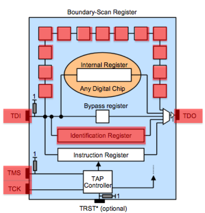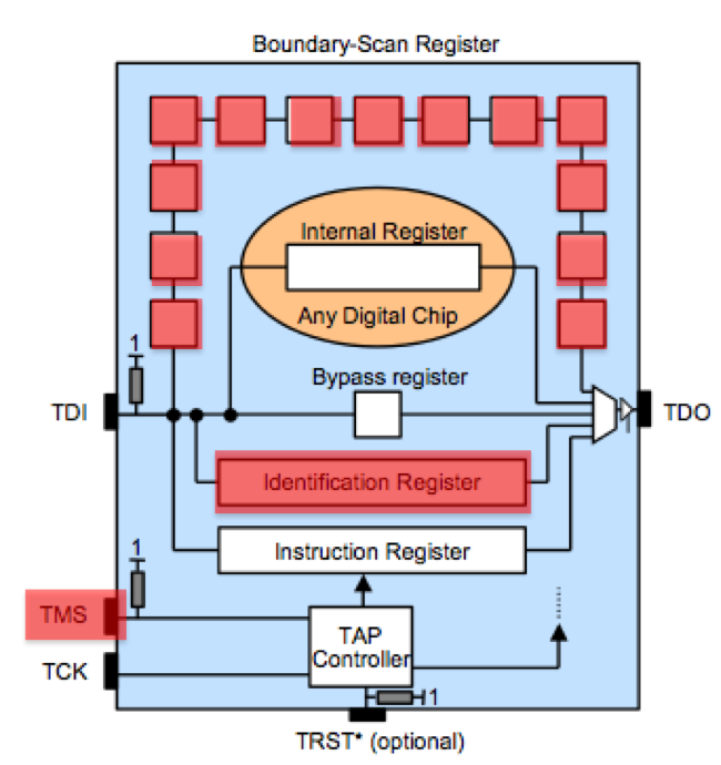 | The Boundary-Scan register can be used to check the state of pins and internal registers (defined in the target chips BSDL file) | If we provide input on TDI we can also set the state of pins and internal registers of the boundary scan, in addition to reading current state | The TMS line is important for being able to switch between different registers. |