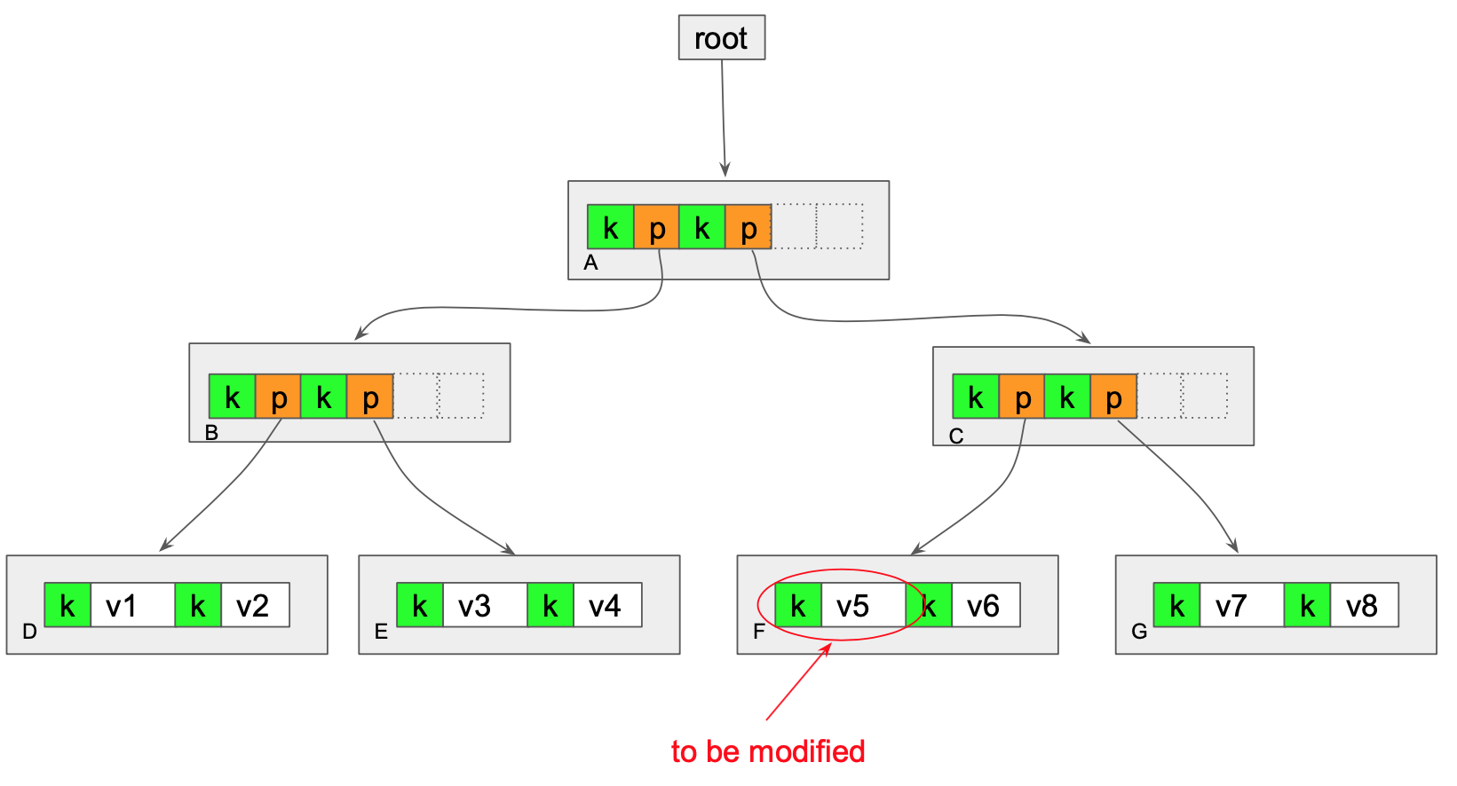 To ensure that any reader that is currently looking at the database via the root page pointer, or in fact any reader that may come along during the execution of our modifications, sees undisrupted image of the database, our modification must not change any pages that are reachable from the root pointer. Therefore, we create a new root pointer, and create an alternative B+-tree that will contain previous database image with our modifications applied: