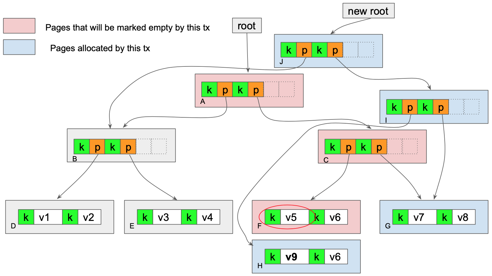 Deleting is a type of modification and all said before about modifications apply here. With deletions, however, there is one more interesting case - pages that were allocated during the transaction (for modification) but then subsequently freed by deletions. For example, if, after modification shown above, we decided to delete record with values v9 and v6, we would end up with an empty page. But this is the page we have previously allocated, and it is not reachable from the root page pointer, therefore it can be reused straight away. Such pages are called "loose pages":