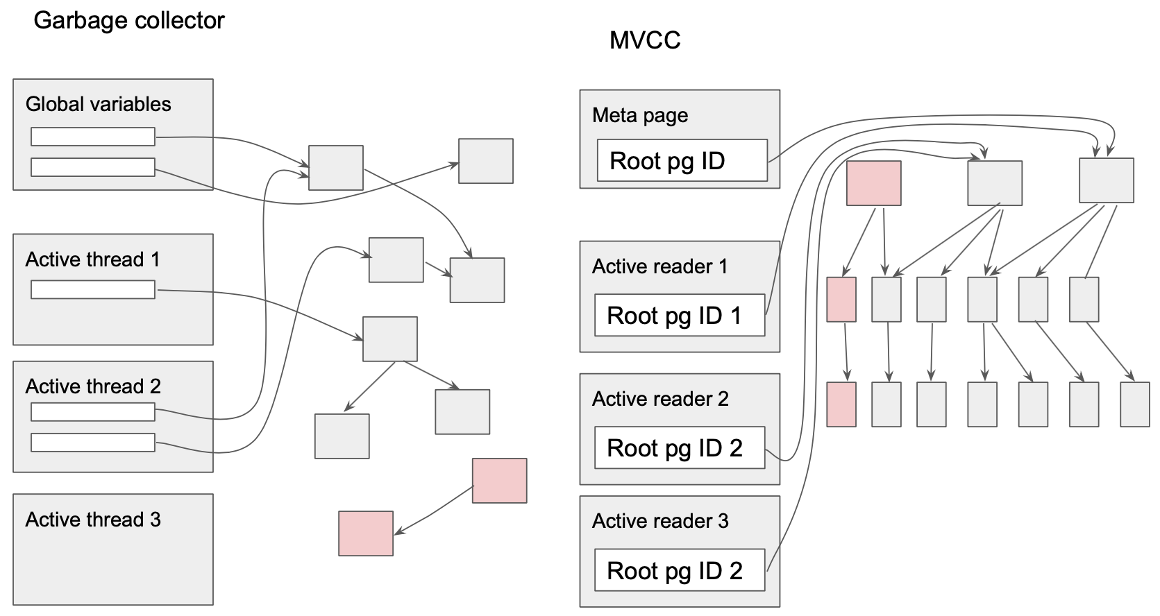 The list of these potentially recyclable pages is called freelist. Most of the pages added to the freelist during modifications, cannot be recycled while the writeable transaction is in flight. This is because any readers connecting before the writable transaction commits, will still see the root and all the pages reachable from it. This is similar to the problem garbage collector faces when determining unreachable objects. Starting points of reachability analysis for a garbage collector are global variable and stack of active threads. Similarly, the starting point for the MVCC reachability analysis are the root pointer (only one global variable) and the root pointers grabbed by any active readers: