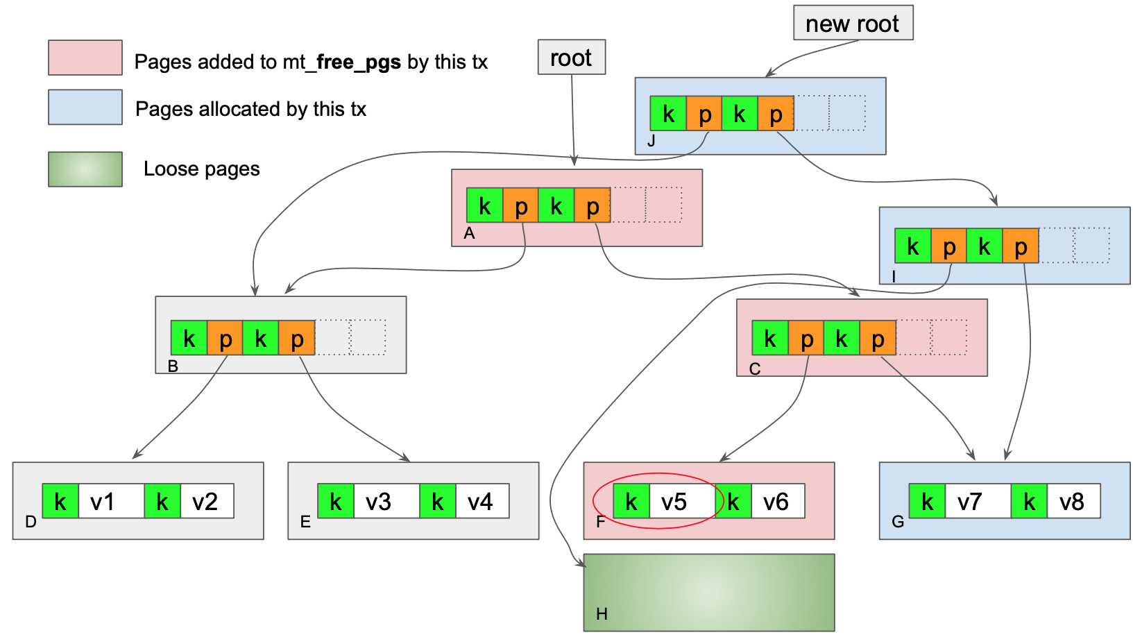 mt_free_pgs, ostensibly for efficiency. If there are many page IDs that were emptied, it is very unlikely that many of them have been allocated by the current transaction, so they are all added to themt_free_pgs, even those some of them might be eligible formt_loose_pgs. The function where appending tomt_free_pgsis performed ismdb_drop0. - When rebalancing is performed, if a page has too few entries, and its neighbour page is also just at the threshold or below, the two pages are merged. This merging creates an empty page, and it is added to the