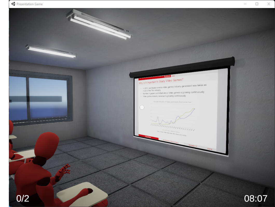 This game can be played with a virtual reality headset or with a keyboard and mouse. The objective is for the player to give a presentation to a virtual audience with their own slides!