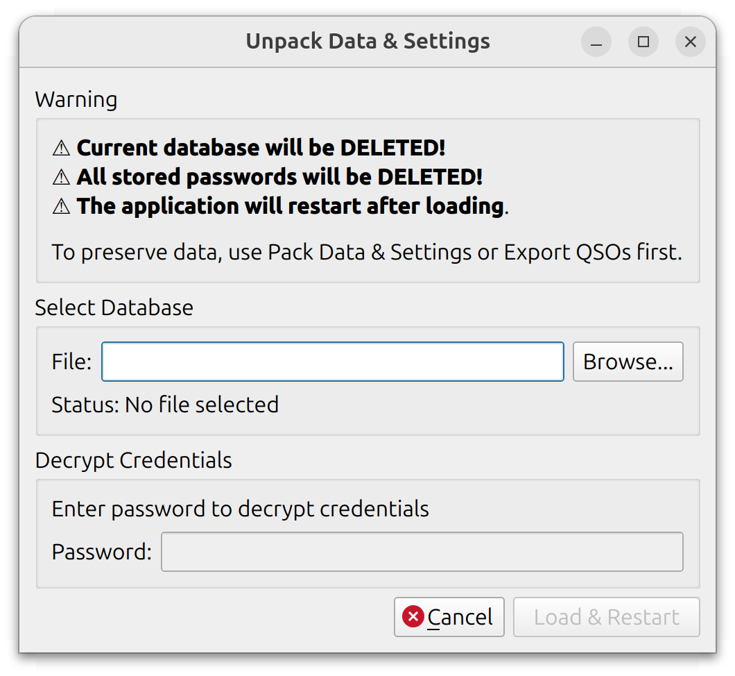 Note: If you lose the password, QSOs and settings can still be imported — only the service credentials will not be restored. The database itself (e.g., QSOs and other non-sensitive data) is not encrypted.