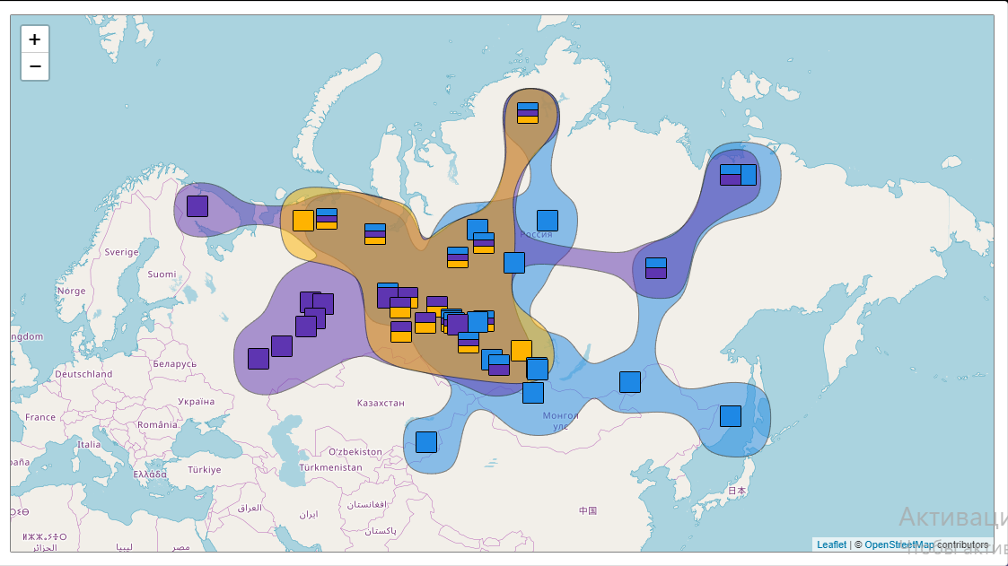 Карта 5. Системы "жёлто-зёлено-синих" систем в уральских языках. В уральских языках существует уникальное явление, не известное нам из описаний других языков Евразии - это наличие одного слова, которое описывает сразу три основных цвета ‘желтый, зеленый, синий’: в южных и центральных диалектах селькупского это слово pádəl, в восточных (лумпокольском, салымском, юганском) и западных (низямском) диалектах хантыйского wóʃte, в ненецких диалектах по данных Ю.Клапрота таким словом было tassedenna, в энецких - tassäráde, в нганасанских - toiakúa. Возникает вопрос, как возникают такие системы? Есть ли какие-то еще специфические черты в их функционировании? Анализ их с помощью нанесения данных на карту Евразии позволил установить, что они образуют достаточно компактный ареал (на карте ниже он обозначен желтым цветом) в Западной и Южной Сибири. Как же он возник? Опять же картографический анализ показал, что этот ареал находится на «месте встречи» ареалов «желто-зеленой» системы, которая, видимо, была исходно свойственна уральским языкам, и сейчас сохранилась в ряде языков (коми, мансийском, на карте это фиолетовый ареал) и «сине-зеленой», которая характерна для тюркских и тунгусских языков Сибири (современного тувинского, тофаларского эвенкийского, на карте они представлены голубым цветом). «Столкновение» этих двух ареалов стало причиной появления уникальных «жёлто-зелено-синих» систем в уральских языков, существование которых, однако, не является стабильным, в архивных материалах XVIII века такие системы были отмечены для большинства хантыйских, селькупских, ненецких, энецких и нганасанских диалектов. А в настоящее время, в результате того, что все носители этих языков постепенно переходят на русский язык, такие системы реально функционируют только в находящихся на грани исчезновения южных и центральных диалектах селькупского языка.