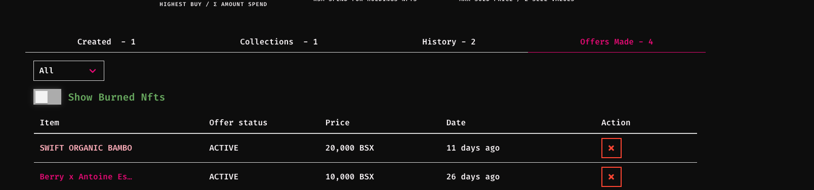 the issue with bsx implementation is that if I'm not mistaken, either if the offer is expired or on burned nft, your stake is not being unlocked. thus maybe #3401 would be a more excellent way to go, but this way to have it here till then is also good, maybe later removed. As currently there is no other way to see your offers on burned nfts tho. |