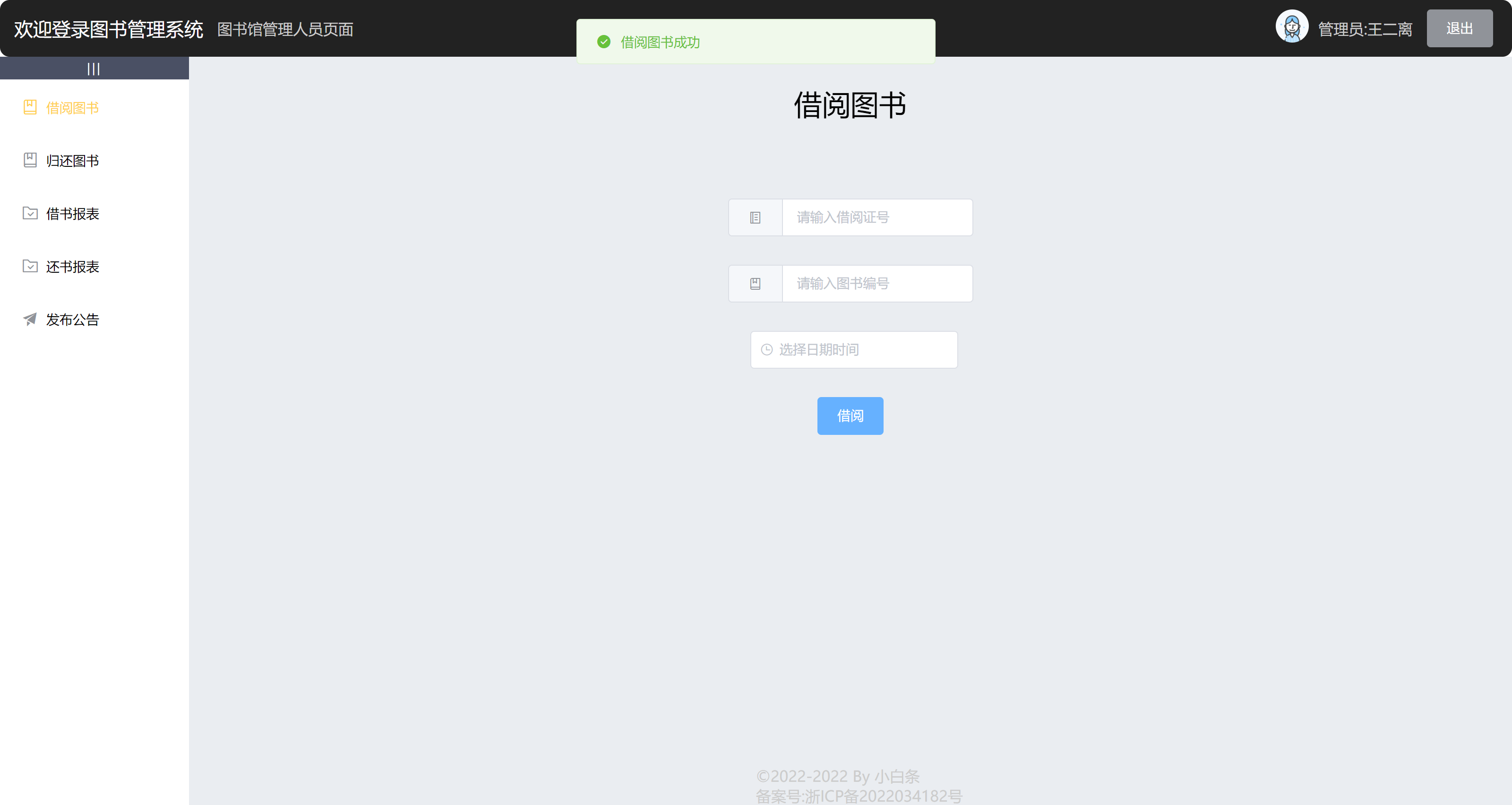 1)借阅图书: 图书管理员输入借阅证号(用户)和要借的图书编号和当前的时间,点击借阅。