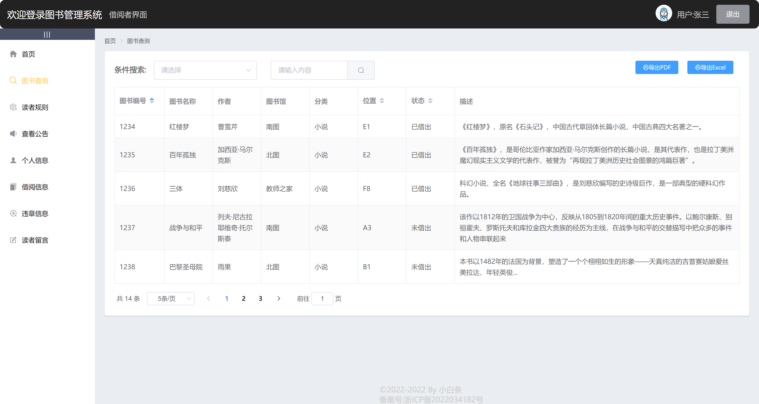 1)图书查询功能:分页构造器缓解数据过大压力,后端可设置请求数防止爬虫请求数过大,服务器负载过大。模糊查询进行字段搜索。表格均可导出 PDF 和 EXCEL。