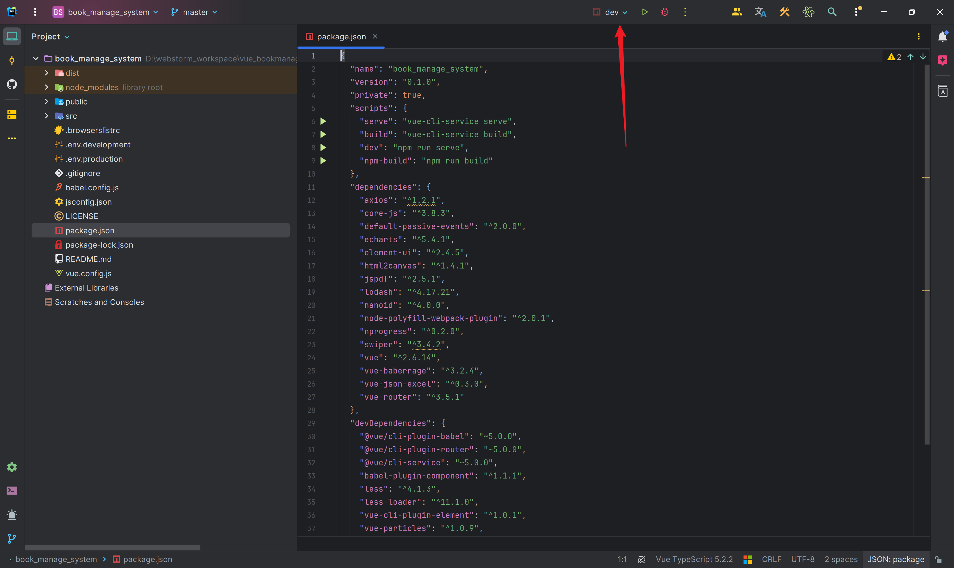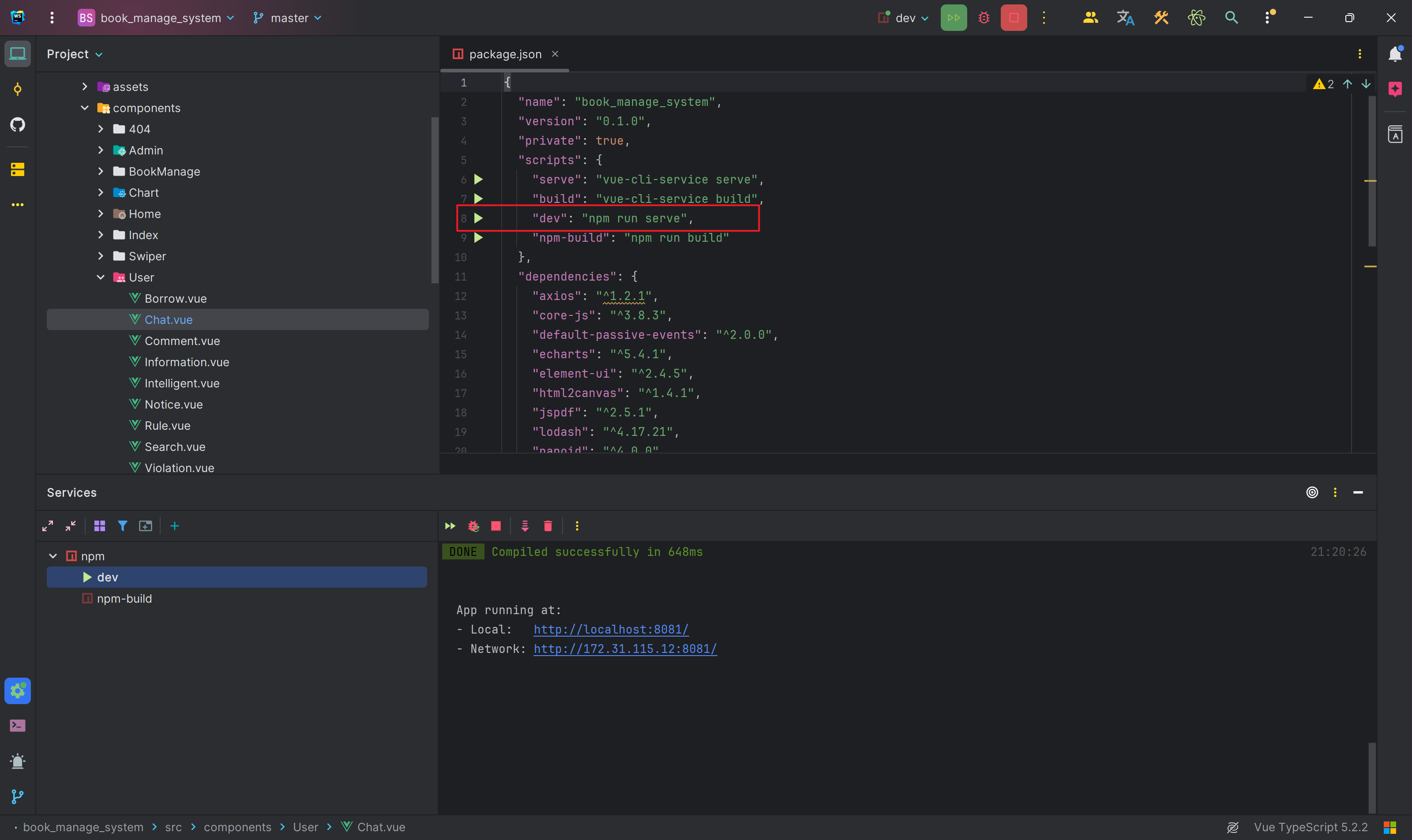 3)直接点击 dev 的运行,或者打开控制台,输入 npm run serve 即可成功启动前端项目。