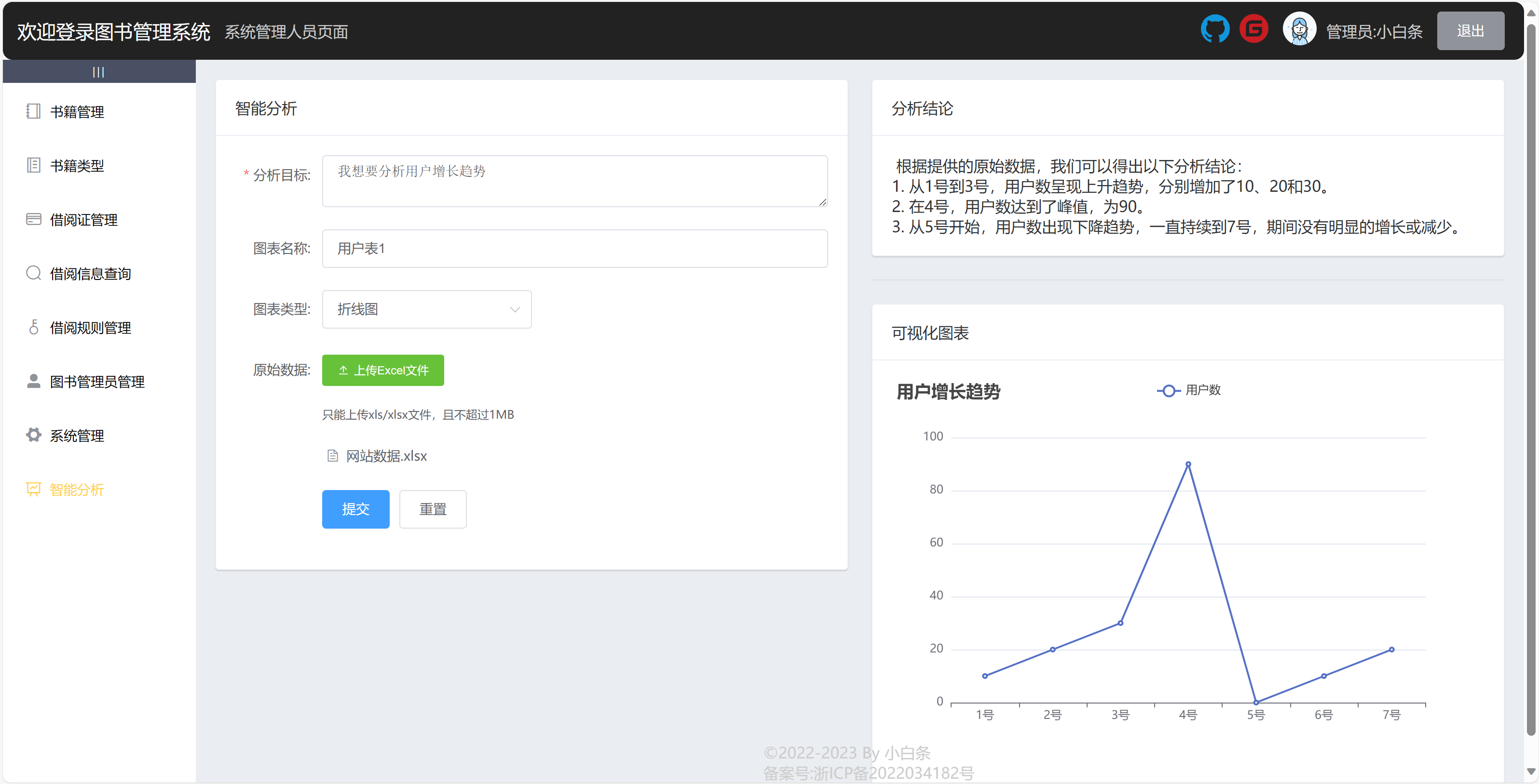 8)系统分析:可以上传某个时间段的借阅量和日期,并且输入分析目标和想要生成的图表类型,等待一段时间后,AI 将会给出分析结论和可视化图表。