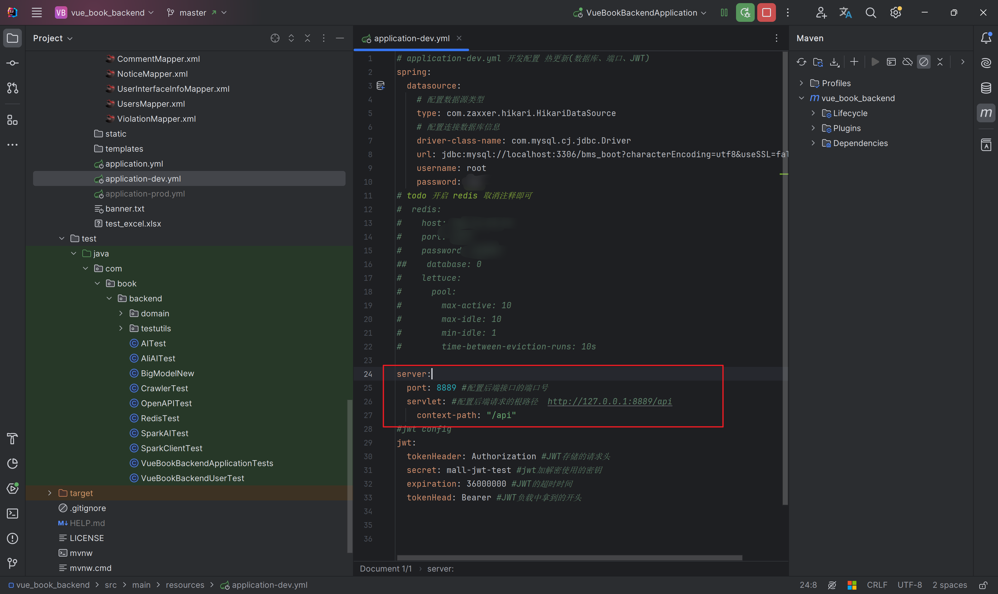 3)用 IDEA 打开后端项目,找到 application-dev.yml 文件,修改其中的 MySQL 配置,保证用户名和密码正确,注:密码不能以数字 0 开头。