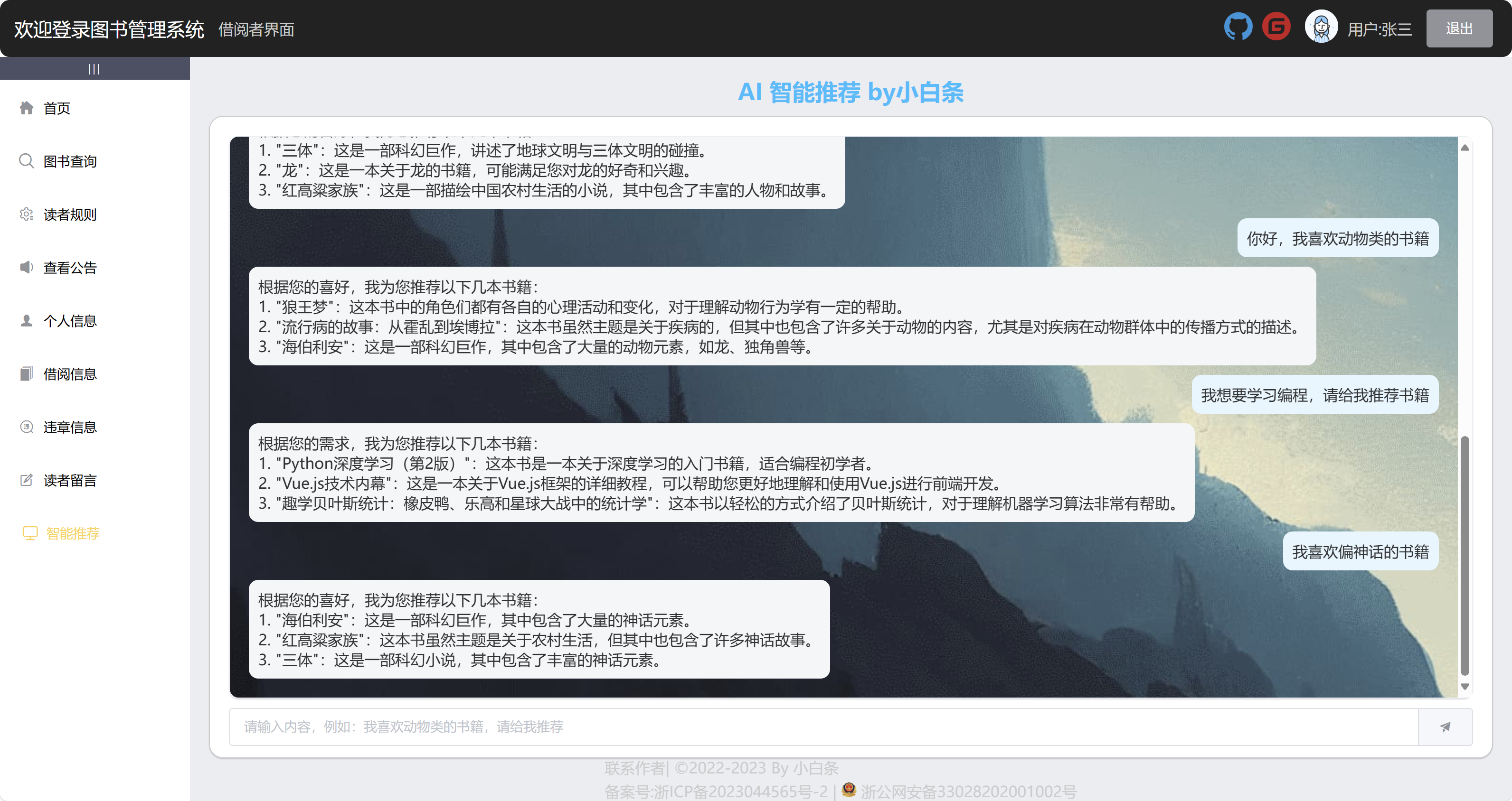 1.增加智能推荐页面,能够与AI进行交流,用户输入自己喜欢xxx类的书籍,AI能够在现有数据库中进行分析,然后给用户作出推荐,调用的是国内AI模型,底层是OpenAI。