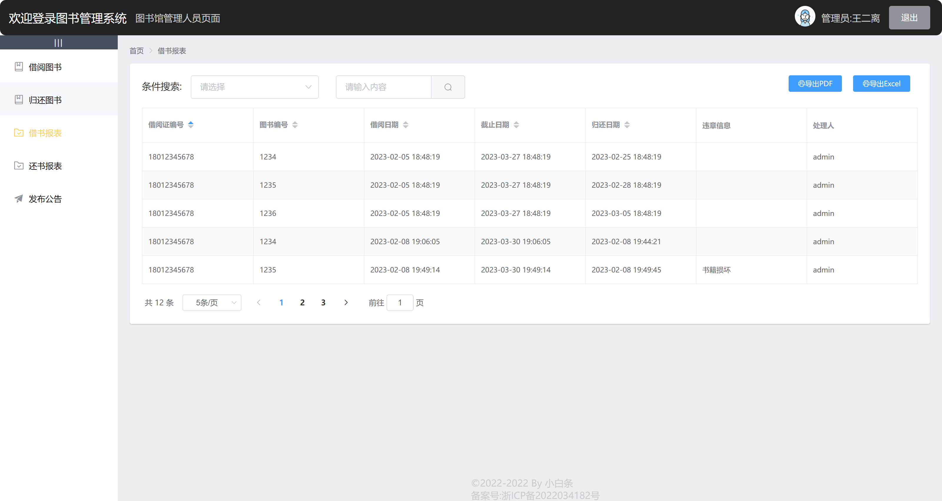 4)借阅信息查询: 可以查询当前已经完成借阅和归还的记录,显示借阅证号,书籍编号,借阅日期,截止日期,归还日期,违章信息,处理人。分页功能,PDF 和 EXCEL 导出。