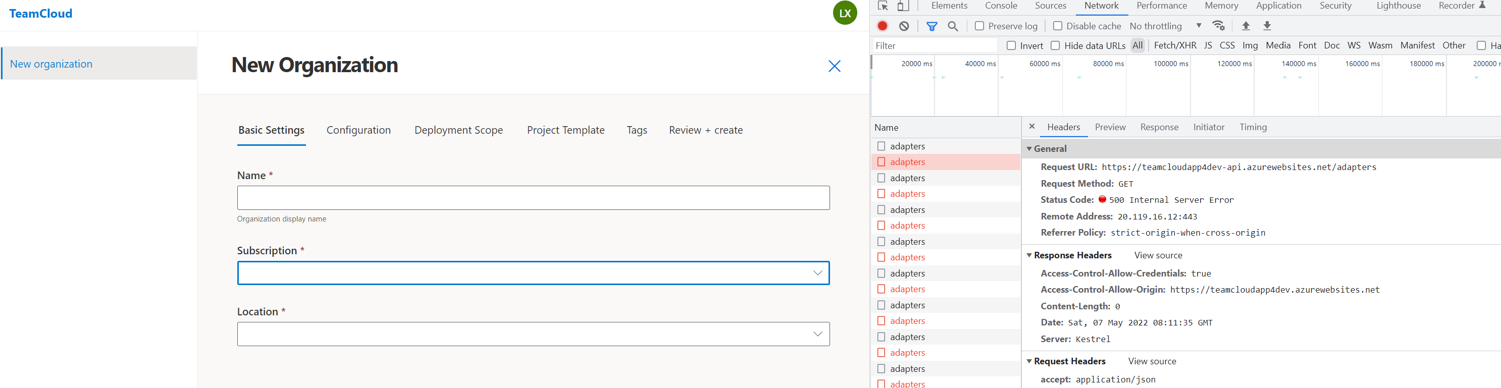 After I login the web of TeamCloud and create the organization, the subscription is empty. After I try to select the list, there is nothing to display and looks like adpaters api cannot work as below:
