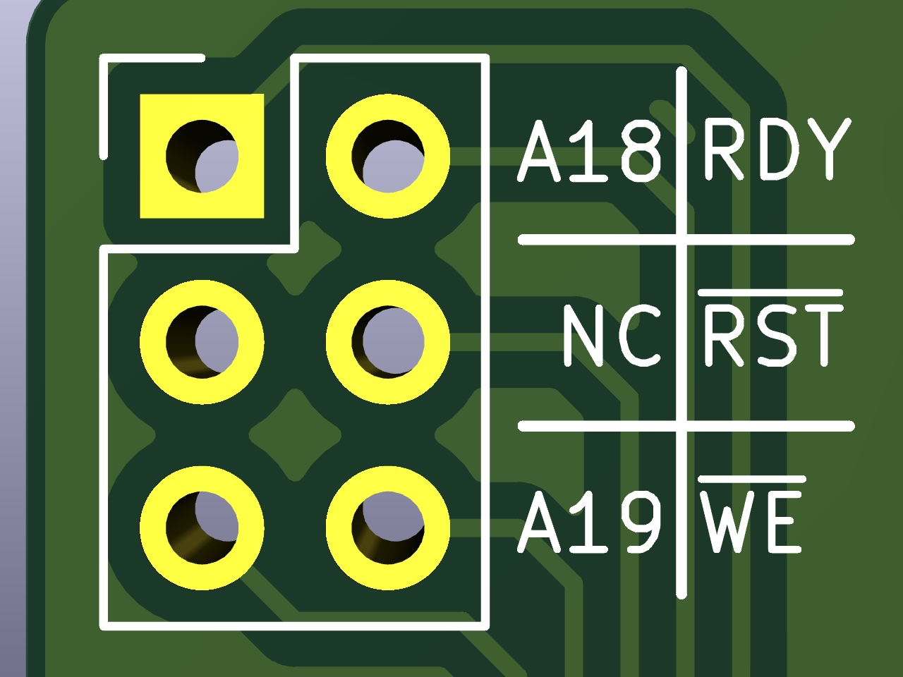 On the left side of the 2x3 pin header are the address lines A18 and A19. Connecting these depends on the type of Flash ROM you have. Usually, these are the pins where you connect a switch to be able to select between different ROMs.