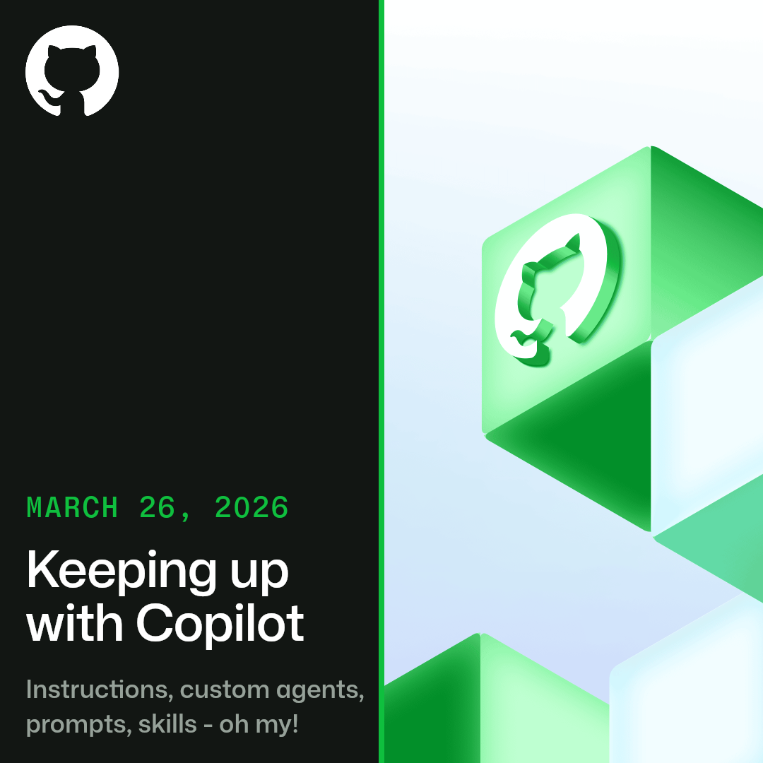 Join us for a practical walkthrough of how to tailor GitHub Copilot to the way your team actually builds. Copilot can be customized in a lot of ways, so it’s easy to wonder what to use when: instructions vs. prompts, custom agents, and where Skills fit into the picture.