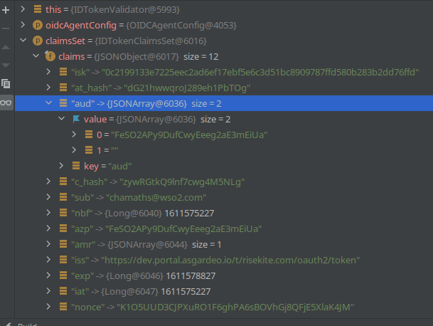 After configuring an OIDC based application in the console, the returned ID token upon calling the https://localhost:9443/oauth2/token contains an empty aud claim value. The value for the aud claim in the ID Token must be trusted by the client and the value must not be null or empty string.[1]
