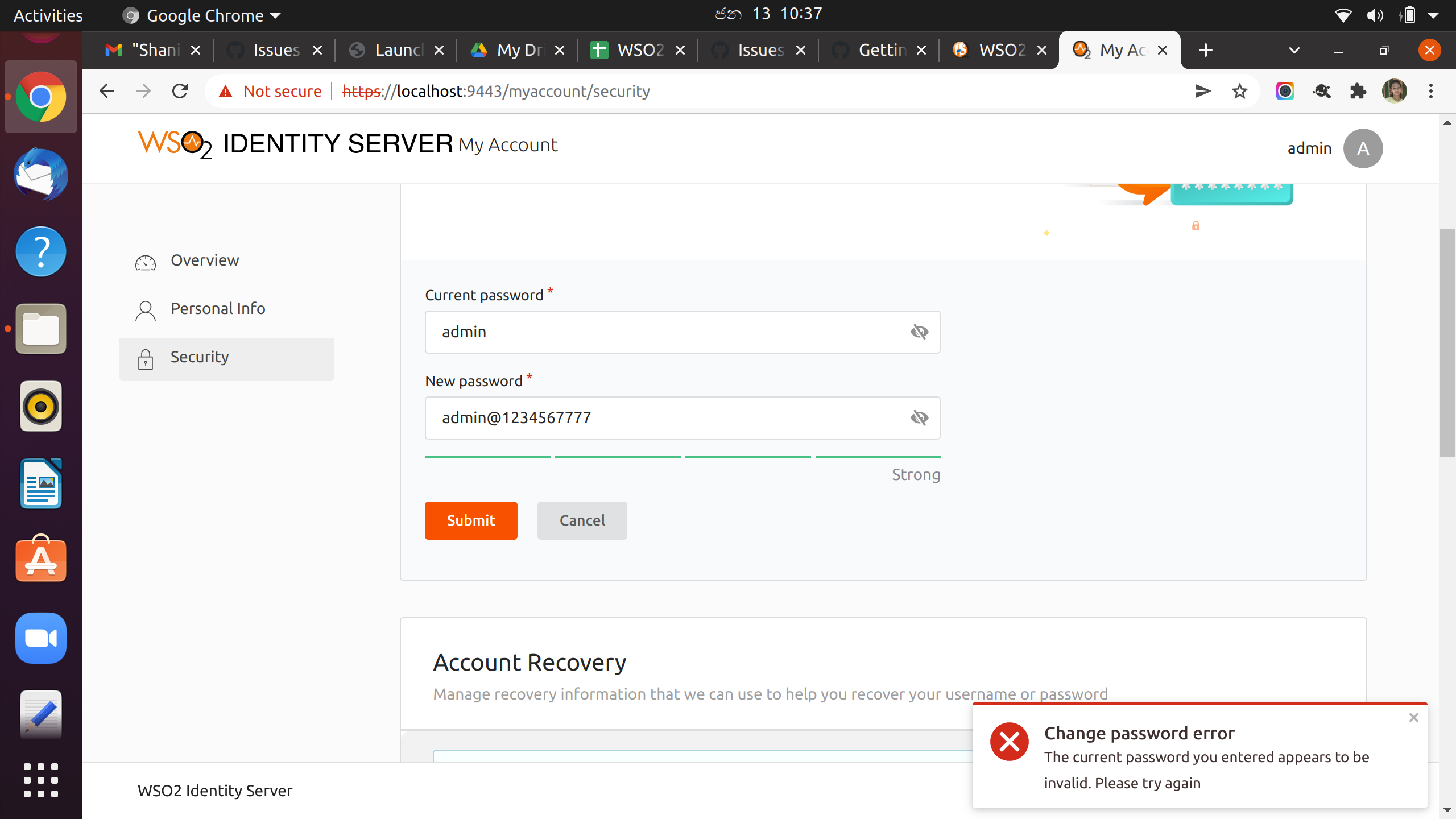 Even though I enter a strong password it doesnt allow to update the password. Getting a error message as password is not strong. Also theres no indicator for a user about the password pattern he needs to use to set a strong password.